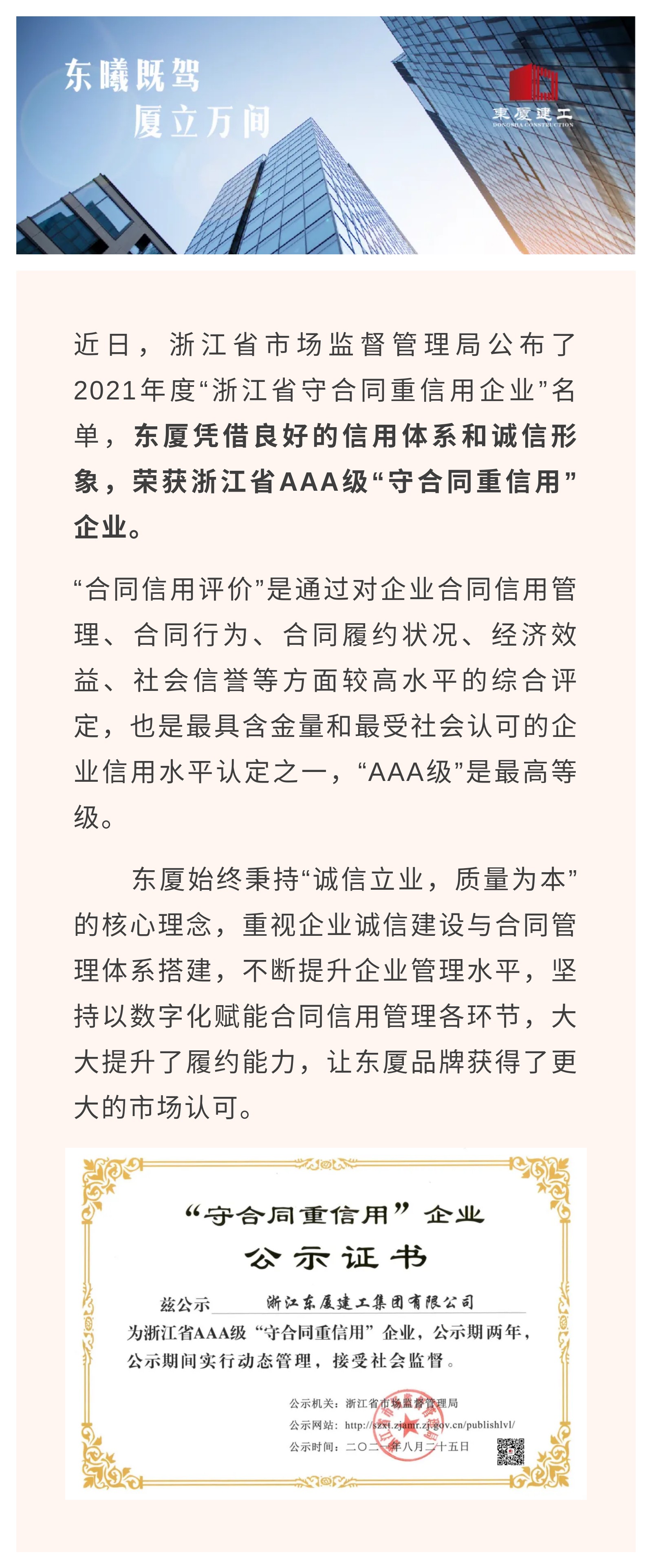 誠信立業(yè) 穩(wěn)健行遠 | 東廈建工榮獲浙江省AAA級“守合同重信用“企業(yè)””