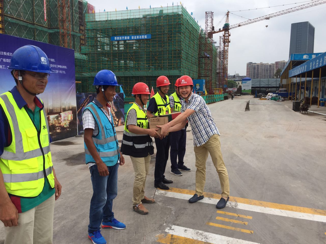 | 進入盛夏以來,熾日炎炎,熱浪滾滾。我公司一線員工仍堅守工作崗位,奔波于施工現(xiàn)場,戰(zhàn)高溫、斗酷暑,用辛勤的汗水給東廈添磚加瓦、創(chuàng)造業(yè)績。他們的生產(chǎn)、生活狀況時刻牽動著公司領(lǐng)導(dǎo)的心。7月13至16日,公司董事長、總經(jīng)理領(lǐng)導(dǎo)帶隊對奮戰(zhàn)一線的項目部進行慰問,慰問組成員冒著高溫酷暑深入基線一層來到貴州、義烏、鄭州等項目部現(xiàn)場,將防暑降溫問品一一送到一線職工的手中,感謝他們?yōu)楣窘ㄔO(shè)作出的貢獻。 同時一再叮囑大家做好高溫防護工作,要求各項目負責(zé)人要高度關(guān)注關(guān)心一線職工的身心健康,合理安排室外工作的作息時間,充分做好后勤保障工作。越是在高溫情況下,越要高度重視安全生產(chǎn)工作,認真制定防暑措施,讓廣大職工度過一個安全、健康的夏季。領(lǐng)導(dǎo)慰問給戰(zhàn)斗在酷暑中的一線員工帶來了絲絲涼意,不僅鼓舞了一線員工的士氣,更激發(fā)了大家的工作熱情。大家表示要繼續(xù)發(fā)揚戰(zhàn)高溫、抗酷暑的奮斗精神,立足崗位,圓滿完成東廈度夏各項工作任務(wù)。