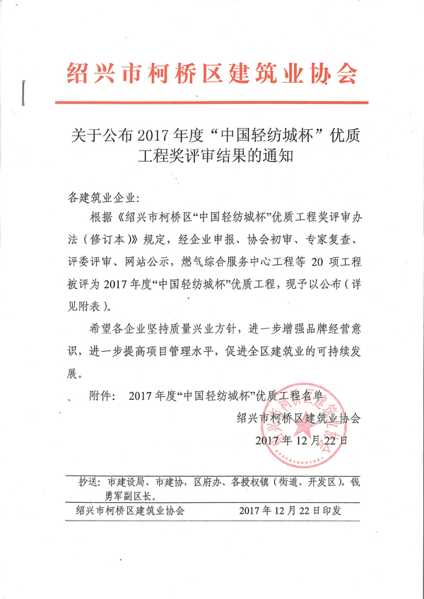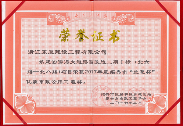 | 近年來,各項(xiàng)目部深入開展創(chuàng)優(yōu)奪杯工作,近日在紹興市市政工程學(xué)會(huì)2017年度會(huì)員大會(huì)上,我司首次被評(píng)為“2017年紹興市市政行業(yè)先進(jìn)單位”,承建的市政工程濱海大道路面改造二期I標(biāo)(北六路-北八路)榮獲2017年度紹興市“蘭花杯”優(yōu)質(zhì)市政公用工程獎(jiǎng)。 同時(shí),中銀國際大廈(CBD-3號(hào)地塊)工程和濱海新建北七路二項(xiàng)工程近日均被紹興市柯橋區(qū)建筑業(yè)協(xié)會(huì)評(píng)為2017年度“中國輕紡城杯”優(yōu)質(zhì)工程獎(jiǎng)。 希望各項(xiàng)目部努力發(fā)揮工匠精神,以建設(shè)精品工程為目標(biāo),互相追趕,互相學(xué)習(xí),敢做潮頭,為公司、為社會(huì)呈獻(xiàn)更多精品優(yōu)質(zhì)工程,再創(chuàng)佳績(jī)。