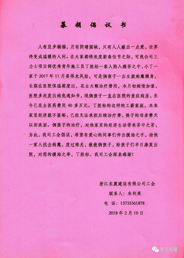 | 我司優(yōu)秀青年員工、鳳凰創(chuàng)新園項(xiàng)目部施工員丁勝標(biāo)同志自去年11月喜得龍鳳雙胞胎以來,因倆孩子身體不好,長(zhǎng)期住院治療,最近又進(jìn)入重癥監(jiān)護(hù)室,醫(yī)院多次發(fā)出病危通知書,大量的醫(yī)療費(fèi)給小丁家?guī)砹四蟮耐纯唷?br />