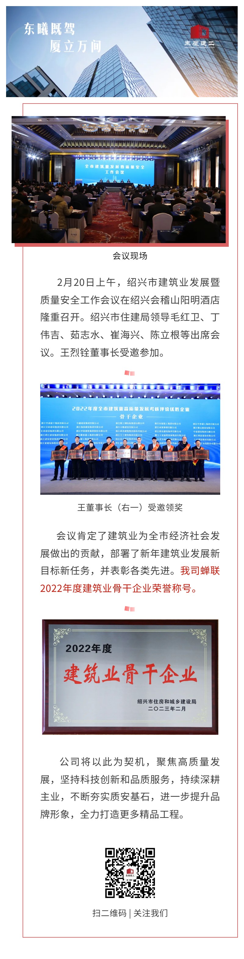 奮楫爭先 篤行致遠(yuǎn) | 公司蟬聯(lián)紹興市建筑業(yè)骨干企業(yè)稱號